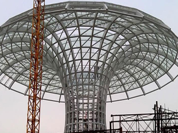 二、球形网架结构因其结构新颖,受力合理,自重轻、用钢量低等优点。如大型体育场馆球形济南螺栓球网架、公共场馆球形网架、电厂济南螺栓球网架、水泥工业球形网架、仓储物流球形网架、济南干煤棚工业球形网架、济南收费站济南加油站球形网架、展览中心、影剧院、商场、航站楼、候车厅、工厂济南车间、仓库、电视塔等球形螺栓球节点网架。国内球形网架结构主要分为:济南焊接球节点网架及螺栓球节点网架两种。螺栓球节点网架其构件工厂内加工量较大,现场安装便捷,适用于现场工期紧,济南施工条件、用电量受制约,网架形状复杂、济南杆件定位困难的异形结构。螺栓球节点球形网架系统基本由济南杆件、螺栓球、支撑支座等组成。按照节点形式可分为交叉济南桁架体系、四角锥体系、三角锥体系等。支撑方式多为固定支座支撑。对于大面积、大跨度及有特殊受力或伸缩要求的网架结构可采用橡胶支座、滑移支座、球铰支座等支撑形式,以满足结构自身的受力稳定、均衡,便于内力释放等设计要求。